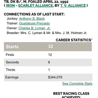 As a youngster, Red Hot Iron appeared to lack the talent to be a successful racehorse and was noted to be quite lazy and extremely unmotivated, often never moving faster than a slow lope at the farm's training track despite encouragement. However, upon her transfer to Philadelphia Park, which is now known as Parx, she quickly transformed, and in a remarkable turn of events, Red Hot Iron went on to win her next four starts in a row after failing at her first start. Red Hot Iron earned an impressive $344,079 in her career as a graded stakes-placed horse. Her final statistics were impressive, with 32 starts and 12 wins, most of which were under jockey Anthony (Tony) Black.